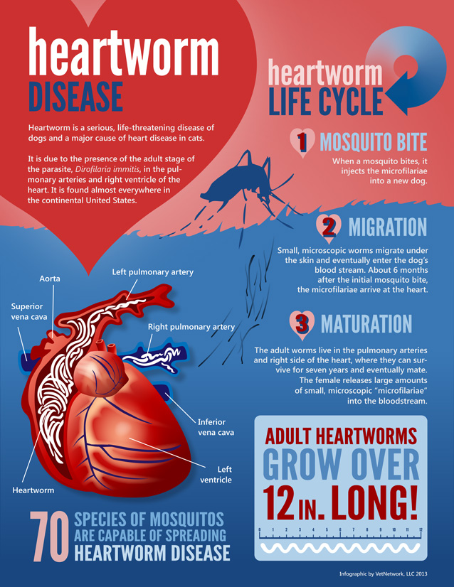 Heartworms are thin spaghetti sized parasites that live within the bloodstream,….adults are usually within the right ventricle of the heart, while the microscopic larva circulate within the peripheral blood stream. They are transmitted exclusively through the bite of a mosquito who has recently bitten an infected dog. It is best to check any dog who is over the age of 7 months before placing them on preventive once monthly medications. Younger puppies can be placed on the medicine without any preliminary check.